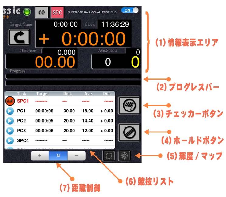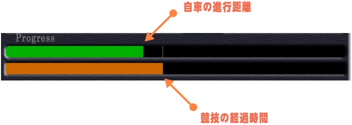 上の「緑色のバー」は、自車の移動距離を現し、一番右へ移動すると、主催者指示距離に達したことになります。