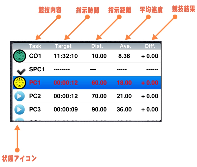 タップすることで、実行する競技の選択、終了、実行待機への変遷が可能です。