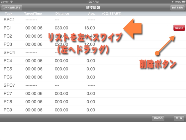 競技リストの項目を、「左にスワイプ」(ドラッグしたままで指を左に動かす)すると、「削除ボタン」が現れます。「削除ボタン」を押すと、一行削除されます。