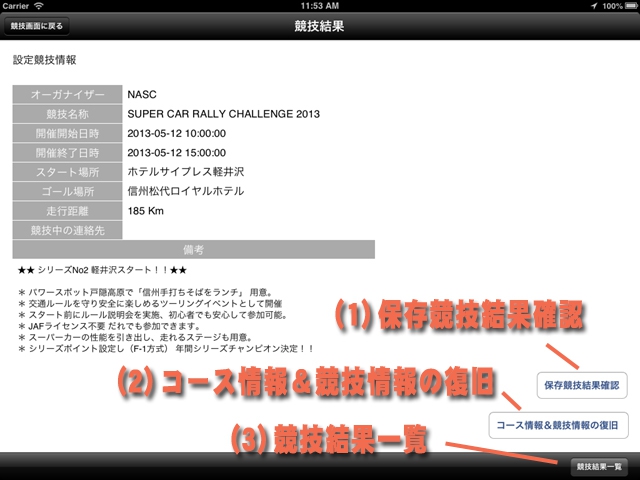 主催者が提供するデータを、 コース情報 から取得して、競技している場合。競技の結果を保存することができます。