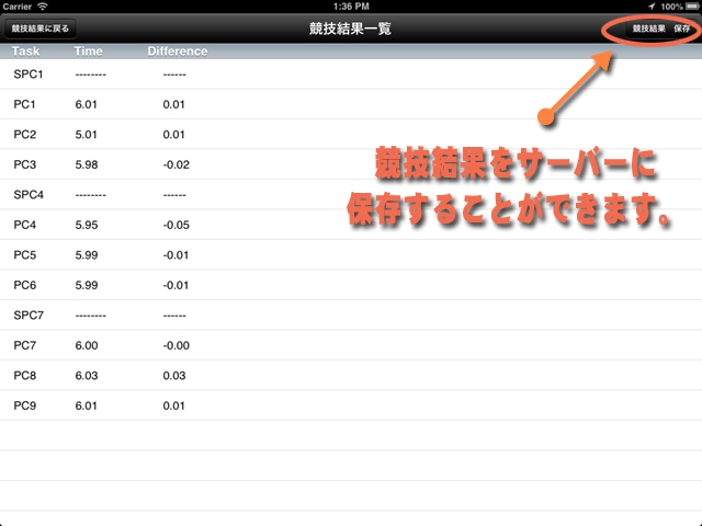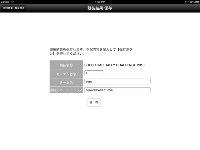 「競技結果 保存」ボタンを押すと、チーム情報と共に、競技結果をサーバーに保存することができます。