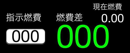 「緑色文字:燃費差」は、「指示燃費」と「現在燃費」の差を表示します。